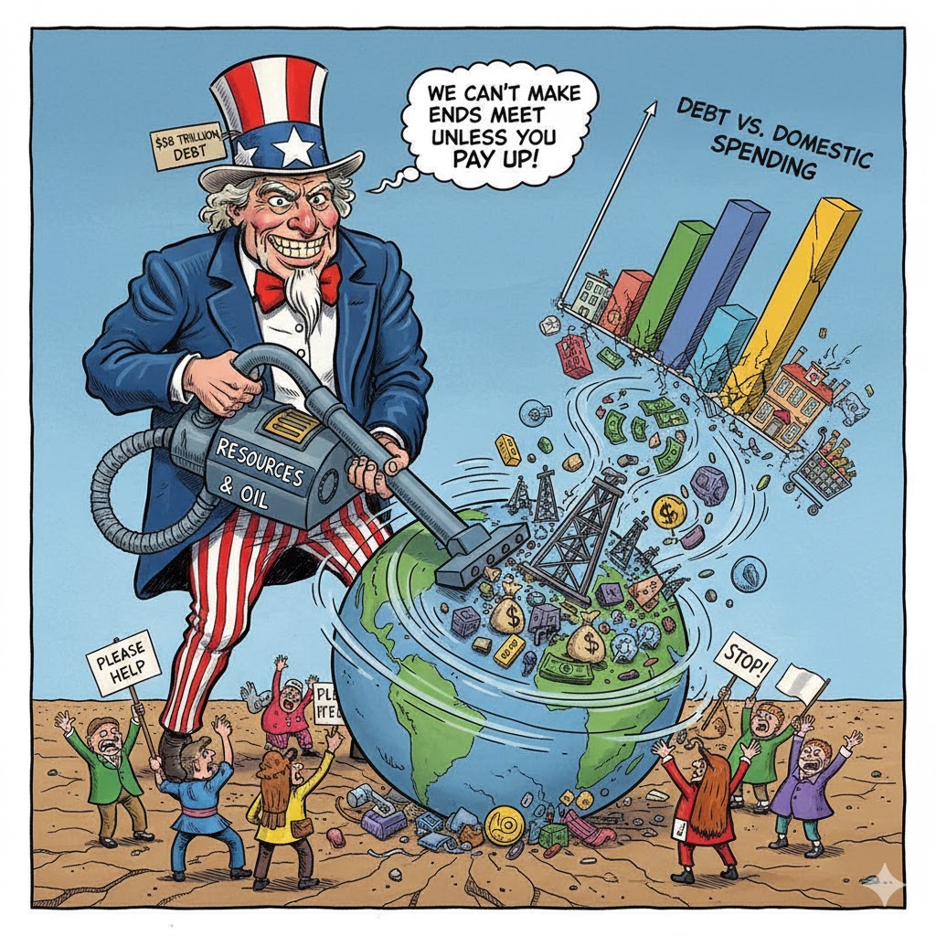 The invasion occurred at a time when U.S. debt was rising in the aftermath of 9/11, and military spending added trillions more. Yet the economic rationale was clear. Controlling Iraqi oil could help offset fiscal strain by ensuring cheaper energy imports and strengthening allied economies. This pattern of resource driven intervention remains a warning today. As debt climbs, similar impulses may resurface, targeting nations whose natural resources could help alleviate America’s economic burdens.